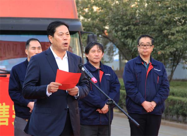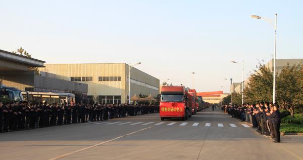 最后,发货车辆启动,参会人员列队马路两边,欢送满载成品的车辆启程。