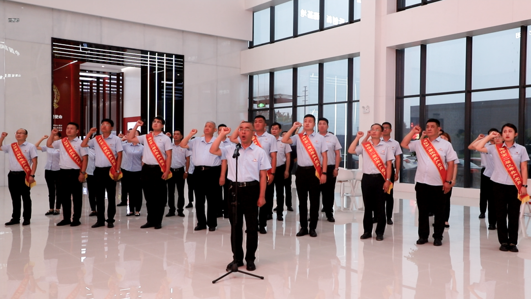 昌邑市非公企业党建联盟秘书长、浩信党委第一书记姜在盛带领预备党员宣誓,全体浩信党员重温入党誓词。