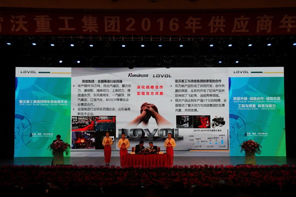 13-4,质量升级战略合作诚信共赢,工程与质量,体系与能力为主题的雷沃重工集团2016年供应商年会在潍坊隆重召开,雷沃重工集团董事长、总经理王桂民,党委书记梁启荣,执行总经理王玉荣及公司经营管理团队出席会议,来自全国的720多家供应商1000多人参加会议,浩信集团董事长吕继贤及营销公司总经理金振伟应邀参加本次年会。雷沃重工集团是一家以大型产业装备为主导业务、以工程机械、农业装备、车辆三大业务为主体的大型股份制企业,2015年实现销售收入215亿元,品牌价值达到335.56亿元,产品质量及销量连续多年居行业首位。